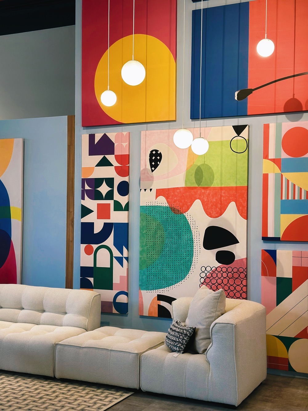 圖畫與地毯呈現大膽的色調交織、幾何與俐落線條的交錯拼接,